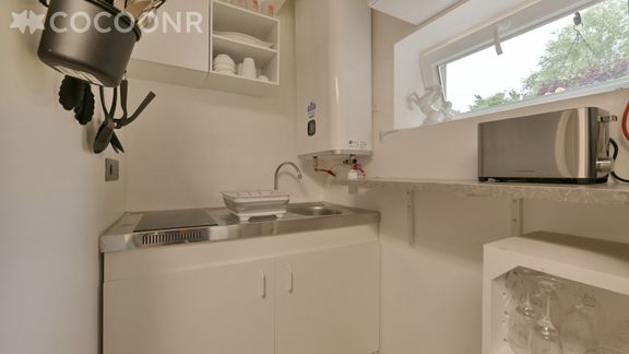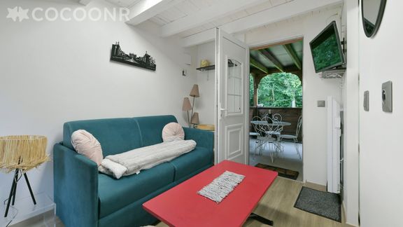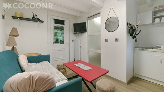 - Une pièce de vie de 7 m² avec canapé, TV ouverte sur une kitchenette équipée avec notamment : four à micro-ondes, grille-pain, plaques de cuisson...