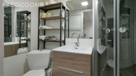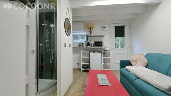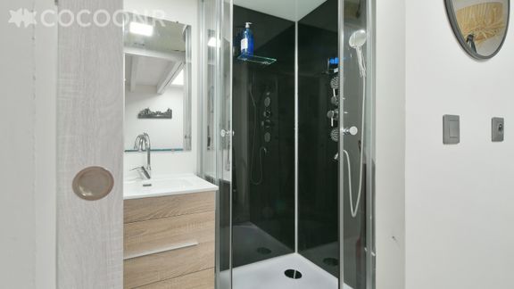 - Une salle d'eau avec douche et WC séparé de la pièce de vie par une porte coulissante
