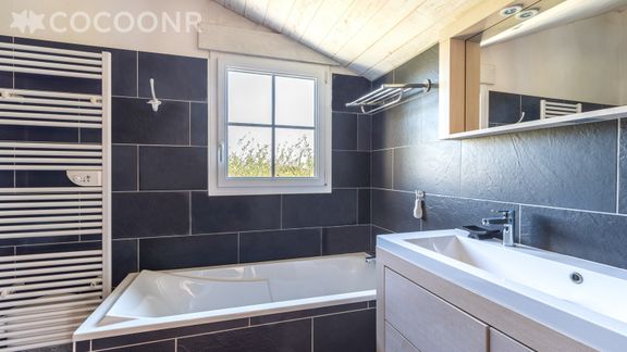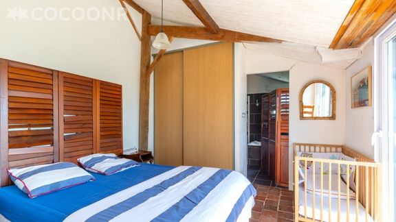 - Chambre 1 : un lit double (140×190), avec lit bébé et salle de bain attenante avec baignoire, douche italienne et WC