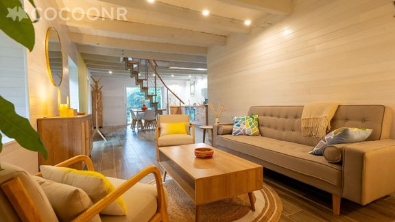 - Une pièce de vie de 50 m² avec TV, canapé, fauteuil et un espace repas