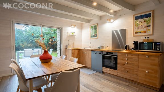 - Une cuisine équipée avec notamment : bouilloire électrique, four, four à micro-ondes, grille-pain, lave-vaisselle, plaques de cuisson...