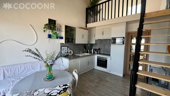 - Une pièce de vie de 37 m² avec canapé, TV, table à manger et une cuisine ouverte équipée avec notamment : bouilloire électrique, four, four à micro-ondes, grille-pain, lave-vaisselle, plaques de cuisson...