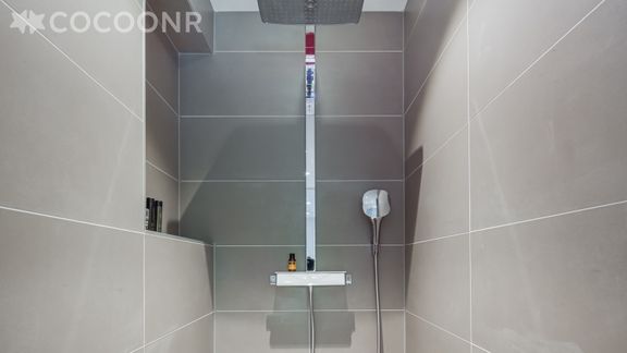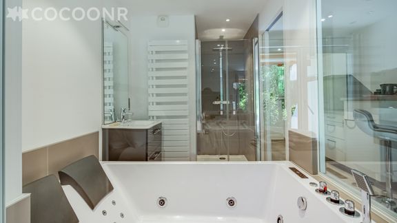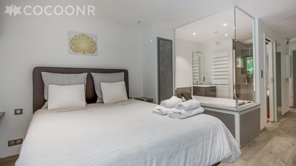 - Une salle d'eau avec paroi vitrée sur la chambre et une douche à l'italienne