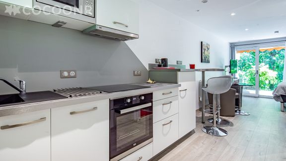 Très moderne, il dispose de tout le nécessaire pour un séjour tout confort : un espace nuit, une cuisine entièrement équipée, ainsi qu’une salle d’eau avec douche à l’italienne et espace balnéo. Vous pourrez également profiter d’une belle terrasse exposée plein sud, prolongée par un agréable espace vert commun ombragé, ainsi que d’une piscine partagée.