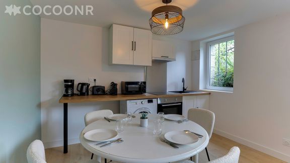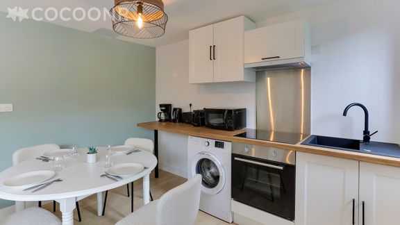 - Une cuisine ouverte équipée avec notamment : bouilloire électrique, four, four à micro-ondes, grille-pain, plaques vitrocéramique, hotte, machine à laver...