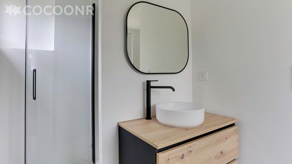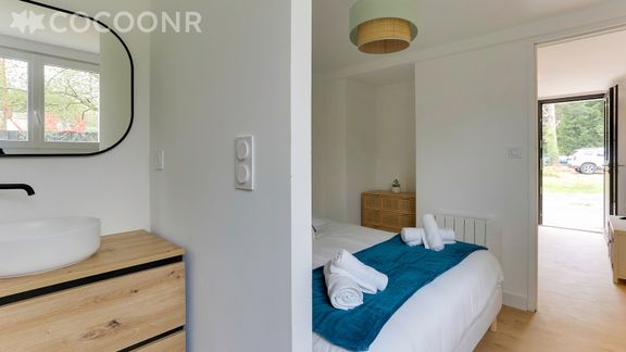 - Une chambre avec un lit queen-size (160×200), salle d'eau attenante séparée par un rideau (sans porte) avec douche italienne, sèche-serviettes, meuble vasque, WC