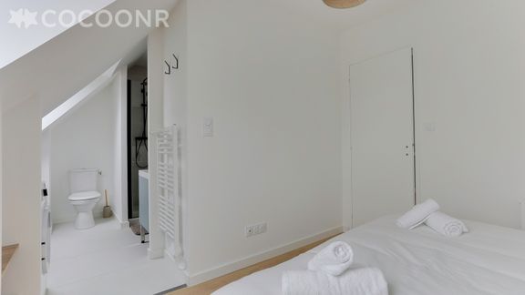 - Une chambre avec un lit queen-size (160×200), salle d'eau attenante séparée par un rideau (sans porte) avec douche italienne, machine à laver, sèche-serviettes, meuble vasque, WC
