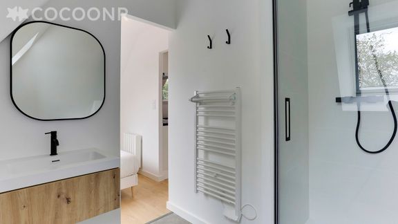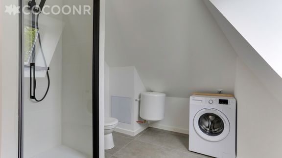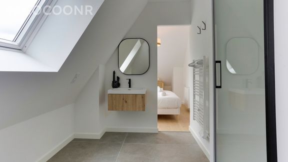 - Une chambre avec un lit queen-size (160×200), salle d'eau attenante séparée par un rideau (sans porte) avec douche italienne, machine à laver, sèche-serviettes, meuble vasque, WC