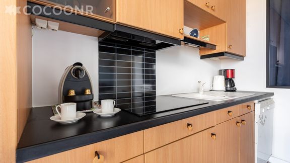 - Une cuisine ouverte équipée avec notamment : bouilloire électrique, four à micro-ondes, grille-pain, lave-vaisselle, plaques de cuisson, cafetière à dosettes Nespresso...