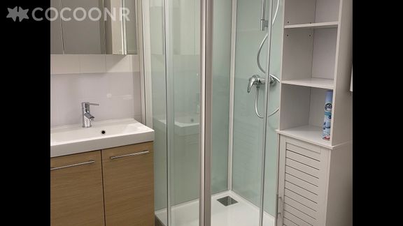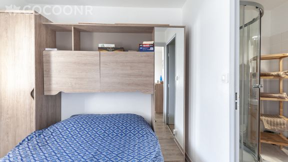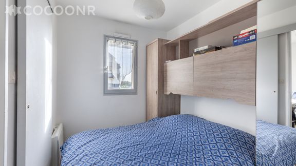 - Une chambre avec 1 lit double (140×190) séparée par porte coulissante avec placards et penderie