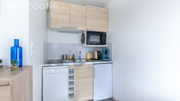 - Une kitchenette ouverte équipée avec notamment : bouilloire électrique, four à micro-ondes, grille-pain, lave-vaisselle, plaques de cuisson, cafetière à dosettes Senseo...