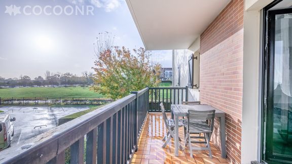 - Un balcon de 8 m² très ensoleillé (exposition sud-ouest) avec table, 4 chaises pliantes et 2 chiliennes pour profiter des beaux jours.