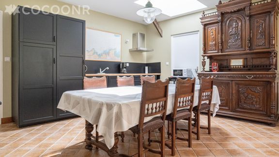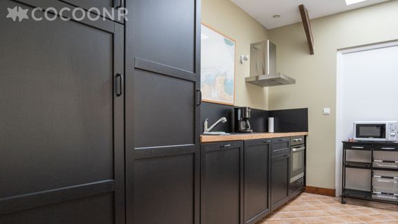 - Une cuisine ouverte équipée avec notamment : bouilloire électrique, four, four à micro-ondes, grille-pain, lave-vaisselle, plaques de cuisson, machine à café à filtre...