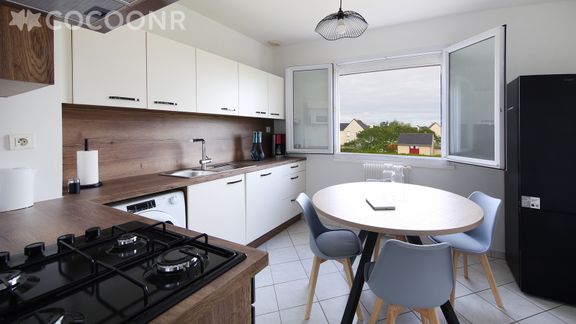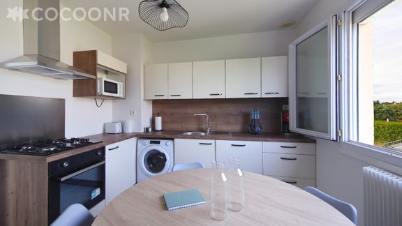 - Une cuisine équipée avec notamment : bouilloire électrique, four, four à micro-ondes, grille-pain, lave-vaisselle, plaques de cuisson...