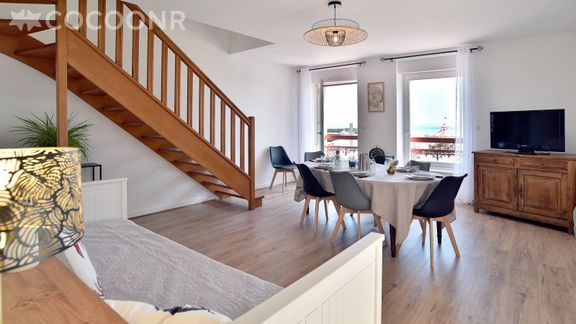 - Une pièce de vie de 40 m² avec canapé, TV, espace repas et vue mer