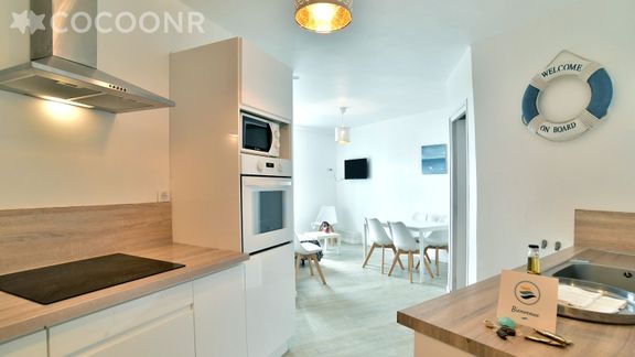 - Une cuisine équipée avec notamment : bouilloire électrique, four, four à micro-ondes, grille-pain, lave-vaisselle, plaques de cuisson...