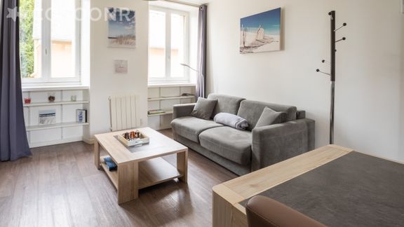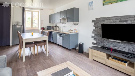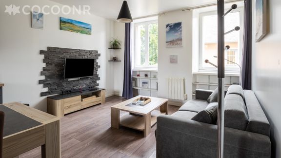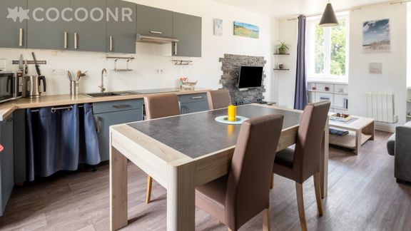 - Salon-séjour lumineux et aménagé avec un canapé-lit double, une TV, une table à manger pour 4 convives.