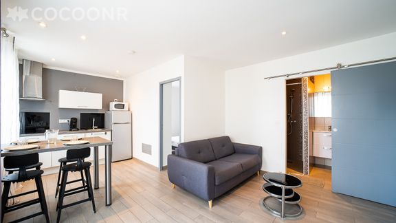 - Une pièce de vie de 20 m² avec TV, canapé-lit double et sa cuisine ouverte