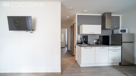 - Une pièce de vie de 20 m² avec TV, un canapé-lit double et une cuisine ouverte équipée avec notamment : four à micro-ondes, lave-vaisselle, plaques de cuisson et son espace repas
