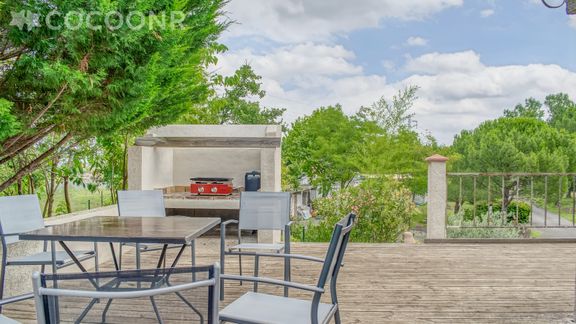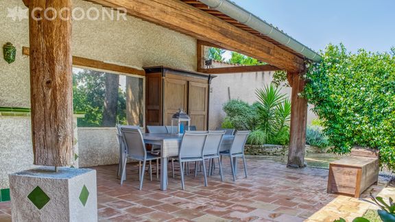 - Grande terrasse couverte en rez de jardin entourant la piscine, équipée avec barbecue, réfrigérateur-congélateur, bar de piscine et cabine de bain/douche. Coin repas avec une grande table pouvant accueillir 8 convives