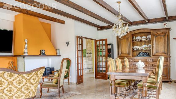 - Séjour salon plein de charme avec ses poutres apparentes, ouvrant sur un grand balcon, aménagé avec des fauteuils, TV, grande table à manger pouvant accueillir 6 convives. Bibliothèque. Buffet rustique.
