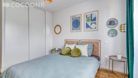 - Une chambre avec 1 lit queen-size (160×200) ainsi qu'un espace bureau pour le télétravail