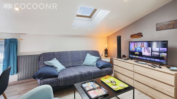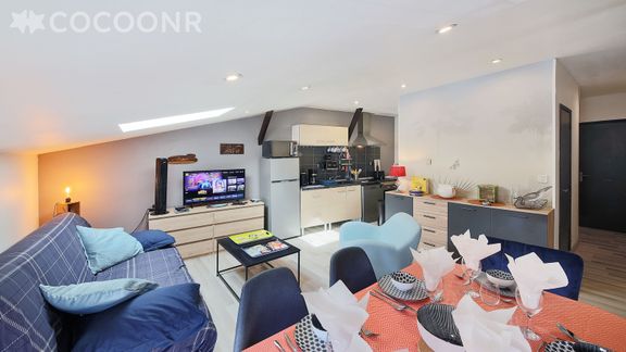 - Une pièce de vie de 38 m² avec canapé-lit double, TV, coin repas