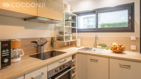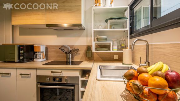 - Une cuisine équipée avec notamment : bouilloire électrique, four, four à micro-ondes, grille-pain, lave-vaisselle, plaques de cuisson... et espace repas.