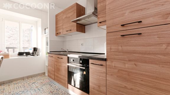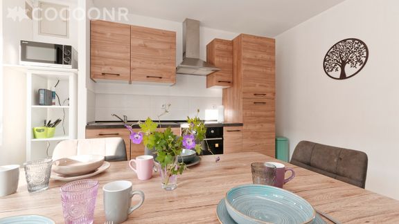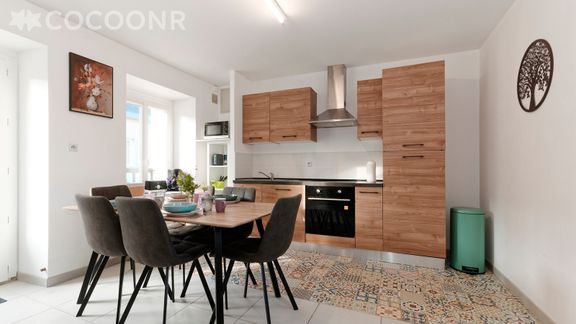 - Une cuisine équipée avec notamment : bouilloire électrique, four, four à micro-ondes, grille-pain, lave-vaisselle, plaques de cuisson...