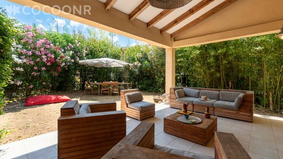 - La terrasse de 20 m² est équipée de mobilier et donne sur le jardin.