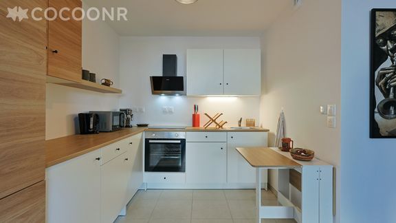 - Une cuisine équipée avec notamment : bouilloire électrique, machine à café percolateur, four, four à micro-ondes, grille-pain, plaques de cuisson...