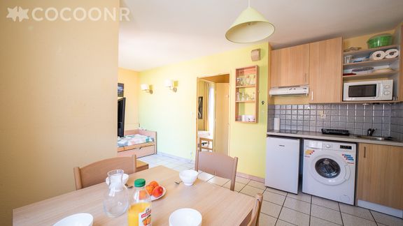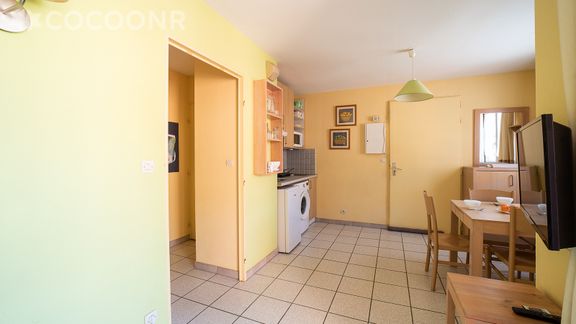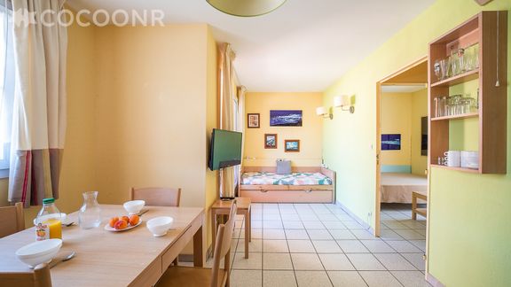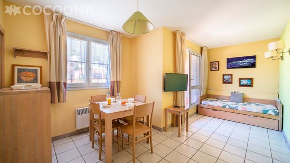 - Une pièce de vie de 10m² avec TV, coin repas et coin nuit avec 1 lit gigogne