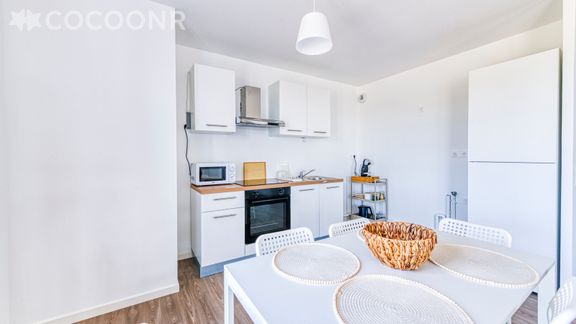 - Une cuisine ouverte, équipée avec notamment : bouilloire électrique, four, four à micro-ondes, grille-pain, plaques de cuisson...