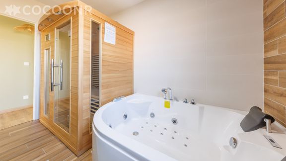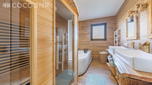 - Une salle de bain avec douche, sauna, baignoire balnéo et deux vasques