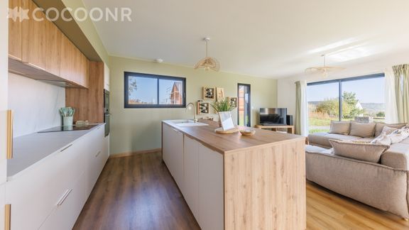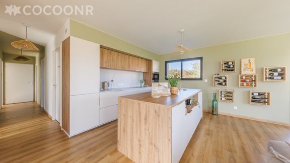 - Une cuisine équipée avec notamment : bouilloire électrique, four, four à micro-ondes, grille-pain, lave-vaisselle, plaques de cuisson... ouverte sur le séjour