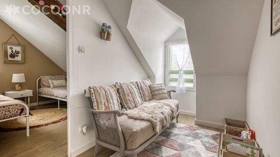 - Dans le couloir, entre les deux chambres, un coin détente avec un canapé