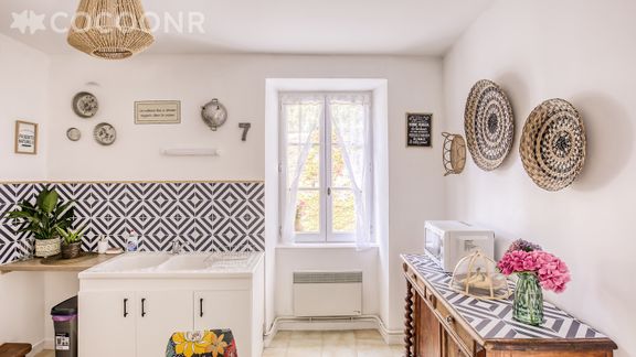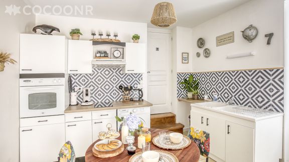 - Une cuisine équipée avec notamment : bouilloire électrique, four, four à micro-ondes, grille-pain, plaques induction, machine à laver...