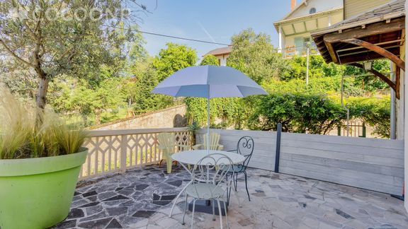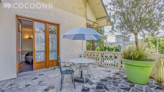 - Une terrasse de 15m² exposée Sud-Ouest comprenant une table, 2 chaises, deux fauteuils et un parasol pour profiter des beaux jours