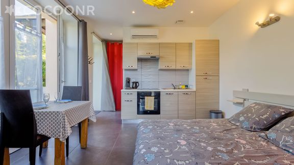 - Une pièce de vie de 25 m² avec un lit double (140x190), TV et coin repas