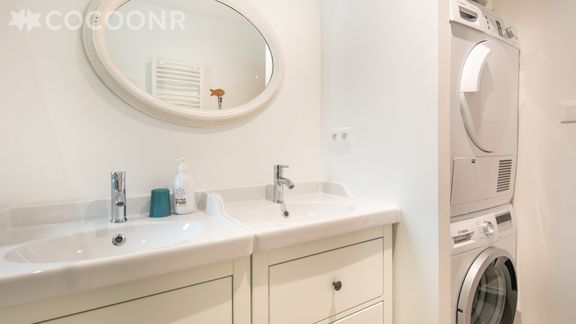 - Une salle de bain avec baignoire, lave-linge et sèche-linge