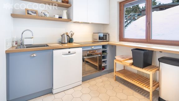 - Une kitchenette équipée avec notamment : bouilloire électrique, four, four à micro-ondes, grille-pain, lave-vaisselle, plaques de cuisson...
