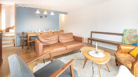 - Une pièce de vie de 30 m² avec TV, canapé, fauteuils et un espace repas