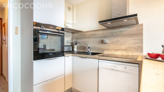 - Une cuisine ouverte équipée avec notamment : bouilloire électrique, four, four à micro-ondes, grille-pain, lave-vaisselle, plaques de cuisson...