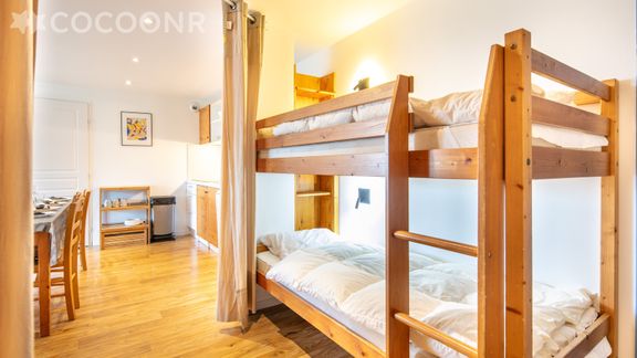 - Un espace nuit séparé de l'entrée par un rideau avec un lit superposé (2 couchages, 90×190)