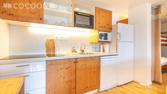 - Une kitchenette ouverte équipée avec notamment : bouilloire électrique, four, four à micro-ondes, grille-pain, lave-vaisselle, plaques de cuisson...