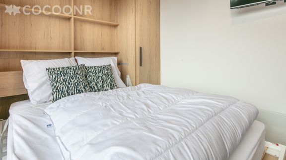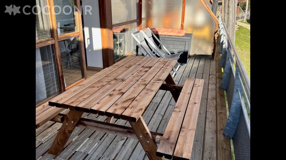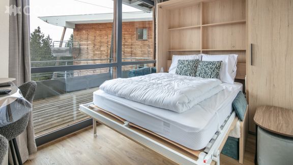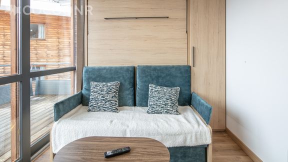- Une pièce de vie de 15 m² avec TV, canapé, lit escamotable (140×190) et un espace repas
