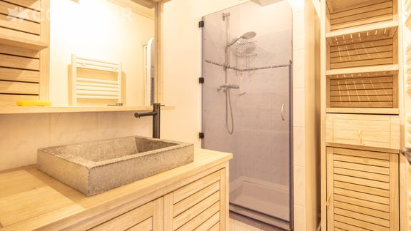 - Une salle de bain avec douche, chauffe serviette, rangements, lave-linge, aspirateur