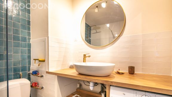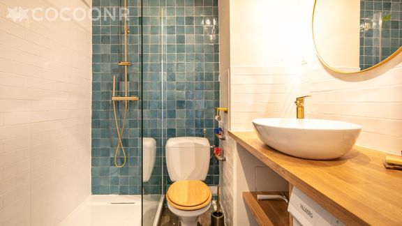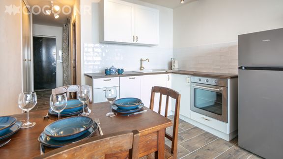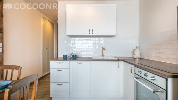 - Une pièce de vie de 17 m² avec espace repas et cuisine, ouverte et équipée, avec notamment : bouilloire électrique, four, lave-vaisselle, plaques de cuisson...