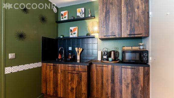 - Une cuisine équipée avec notamment : bouilloire électrique, four à micro-ondes, grille-pain, plaques de cuisson...