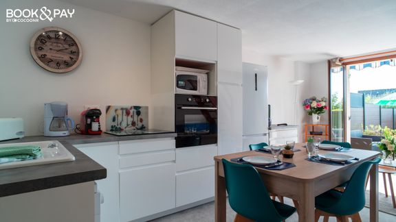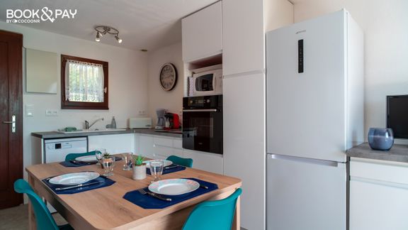 - Une cuisine équipée avec notamment : bouilloire électrique, four, four à micro-ondes, grille-pain, lave-vaisselle, plaques de cuisson...